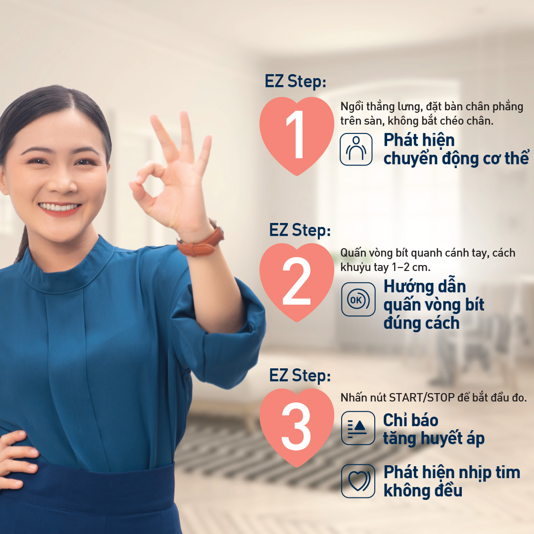 Đèn hướng dẫn quấn vòng bít: Hướng dẫn người dùng quấn vòng bít đúng với chỉ định “OK” để đảm bảo đo huyết áp chính xác và đáng tin cậy.